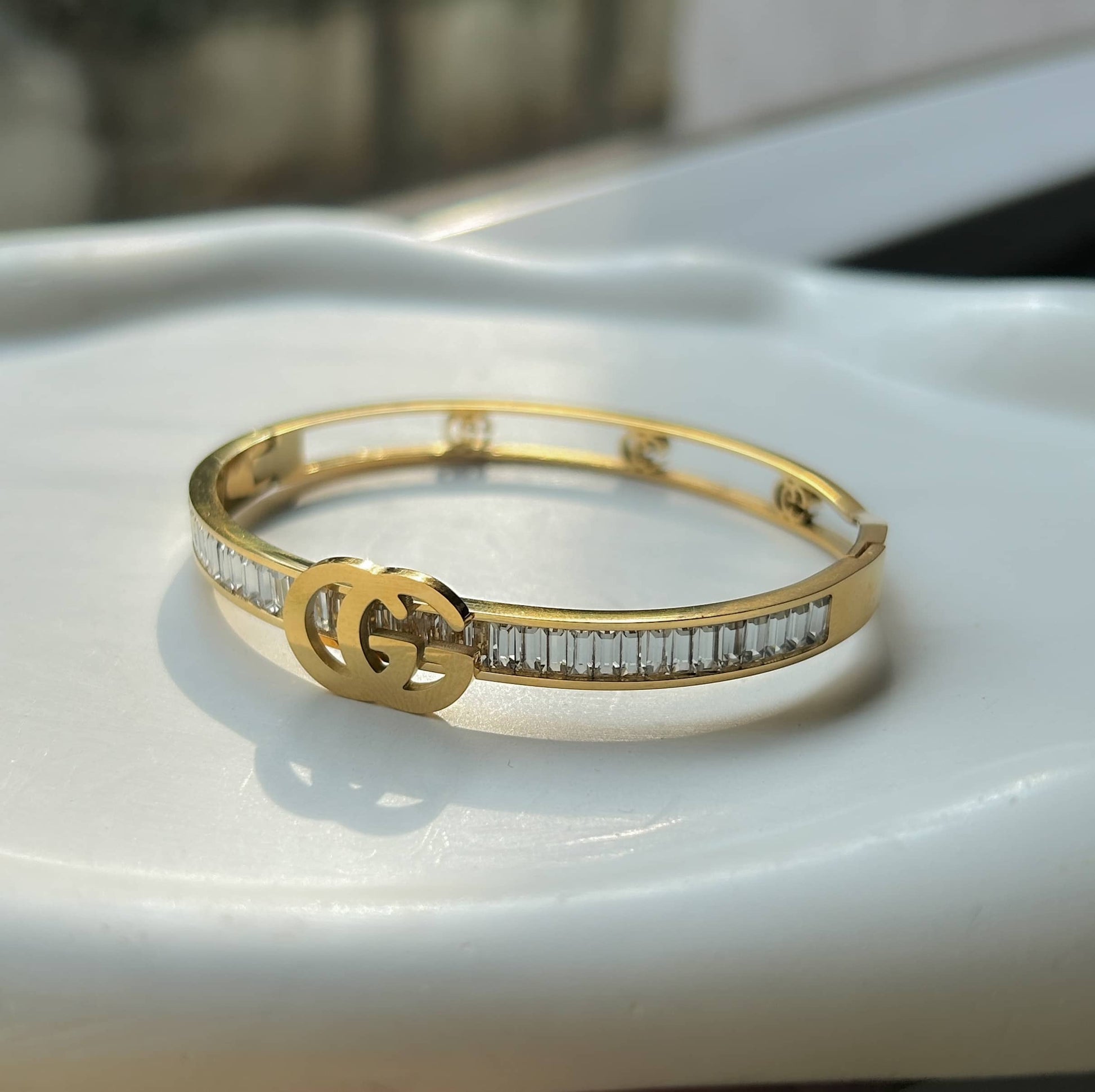 Stoned Gucci Bracelet features a half rim with sparkling stones and the iconic Gucci logo at its center. Crafted from anti-tarnish waterproof 18K gold plated stainless steel, this bracelet is both fashionable and durable, making it the perfect addition to any jewelry collection.