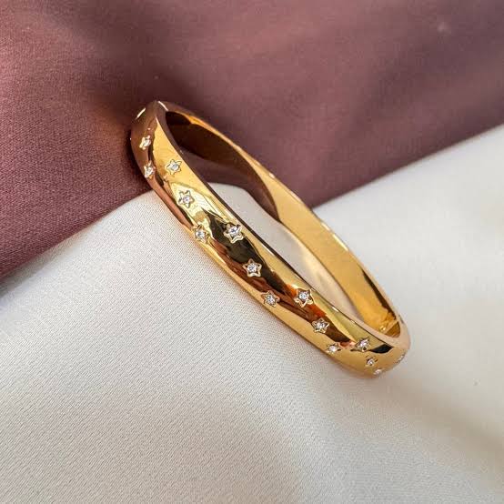 The Starburst Bangle features delicate star engravings with sparkling crystal centers — a perfect blend of elegance and radiance. Crafted from 18K gold-plated stainless steel, it’s waterproof, anti-tarnish, and skin-friendly, made to glow with you from day to night.